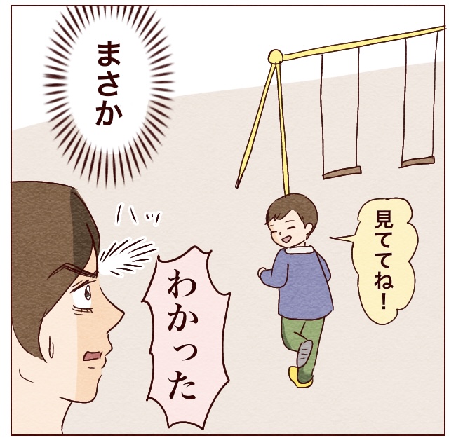 ブランコ好きなのにずーーーっと漕げなくて、お友達にもバカにされてて、私も気にして年少の頃から練習に付き合って、すぐ「もうやらない!」とか言うからキレて泣かせたりして、でもあまりに出来ないからここ数ヶ月は放置してたんだけど…