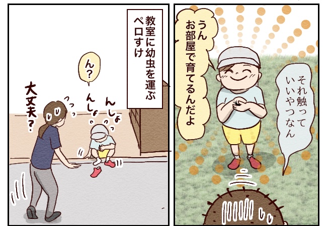 ペロすけなんか絶対触らないタイプの虫なんだけど、幼稚園の同調圧力というかお友達がやってるからやりたい!って気持ちはすごいね。