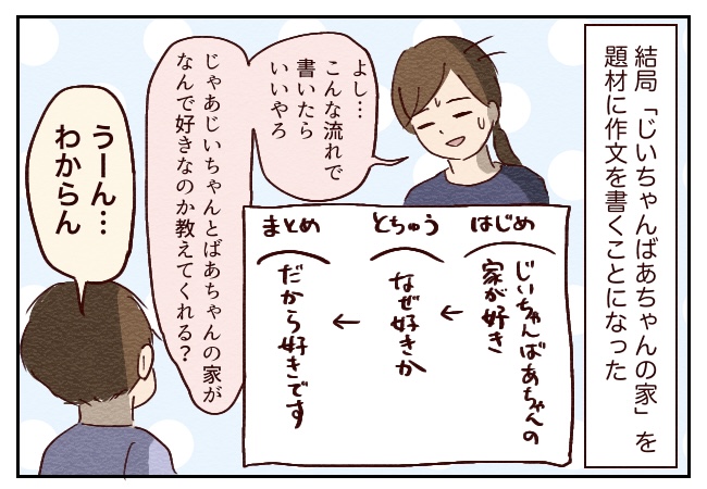 この時点で一体誰の作文やねんという感じになるので、最低でもケロきちの考えをちゃんと聞いて反映したものに仕上げたかったのですが…