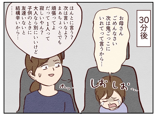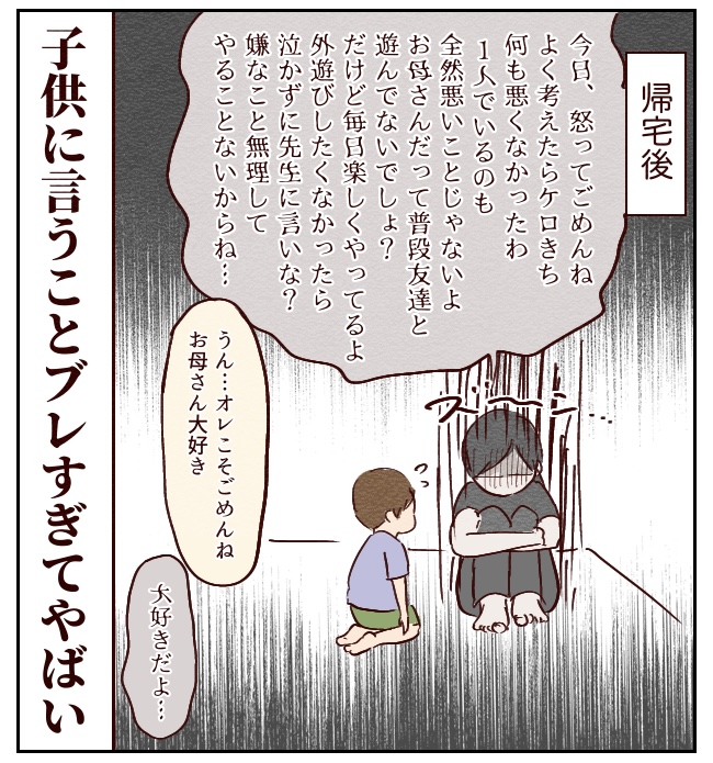 1時間後には撤回してケロきちに謝れたのは自分にとっては成長だったけど、ケロきちにとっては「お母さん言ってることめちゃくちゃ」だよなぁ…