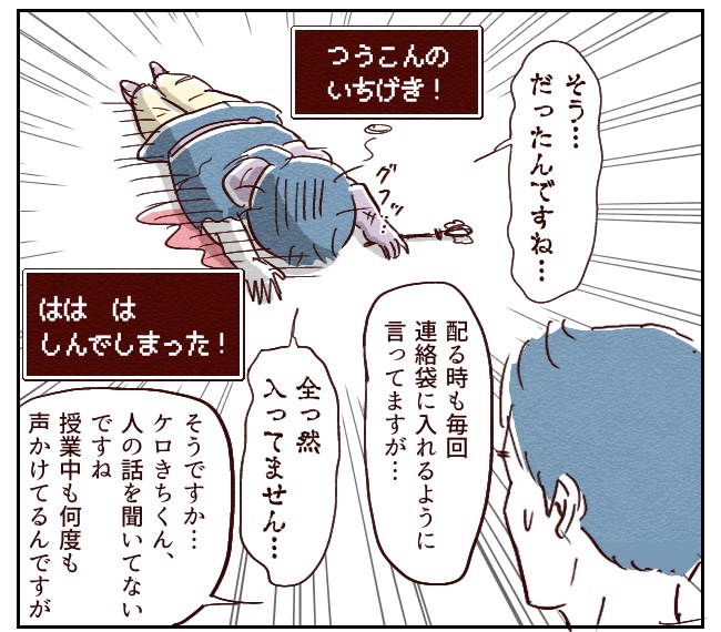 それはそうと、この後先生に「ケロきちが話を聞いてない」という追加情報もいただき、無事死亡しました。
