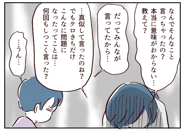 他の子が言ってたからってのが本当だったとしても、授業1時間つぶして指導されるなんてよっぽどケロきちのが目に余る行為だったんだ‥。