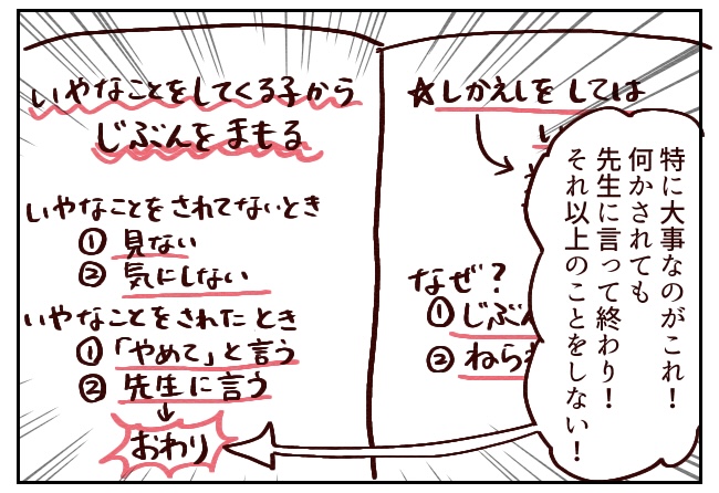 というわけで、「やり返さない、先生に言って終わり」を基本方針とすることにしました。