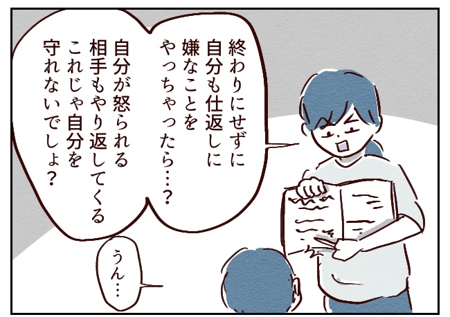 でもケロきちの場合、やられた以上のことをやるかもしれないし(被害者意識強めなので)、相手が何もしていない時にも「以前やられたのが嫌だったから」という理由でやっちゃってるし、相手からさらにやり返された場合うまく自分を守れない(不器用、言葉も幼い)だし…