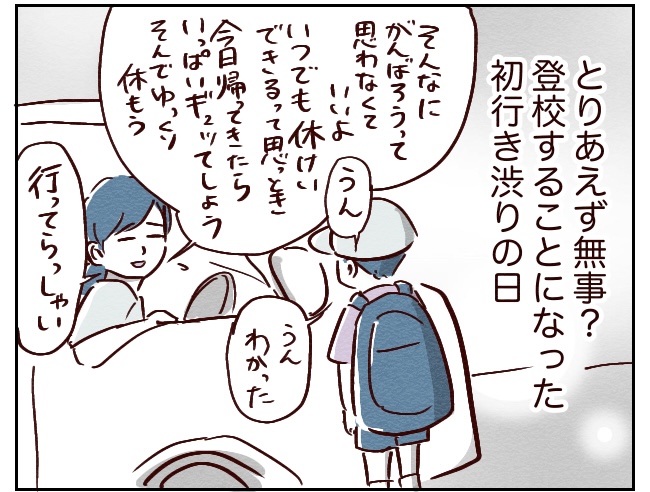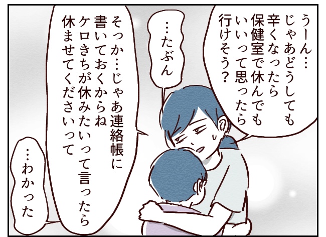 ひとまず送り出す時には思いつく限りの優しい言葉をかけ、辛かったら先生に言って!迎えにも行くからね!(連絡帳に書いた)と伝えました。