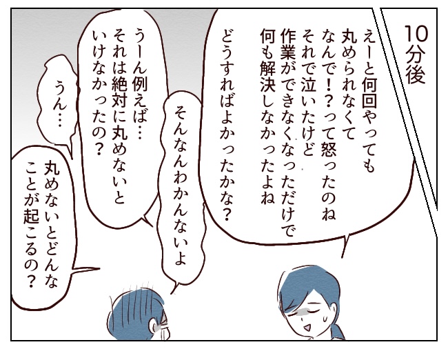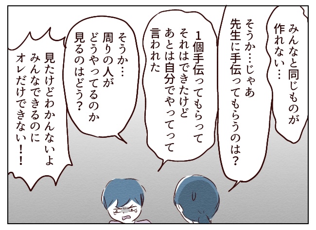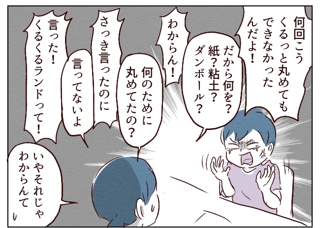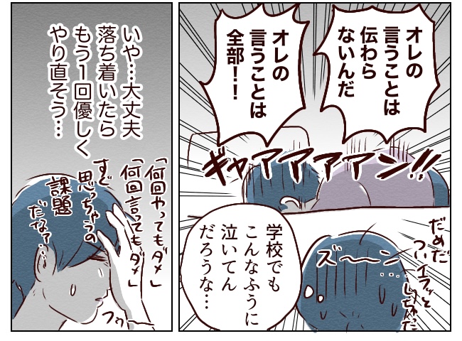ちょっとしたことでも説明できなくてギャン泣き、「そんなのわかんない!」「なんでわかんないの!?」「オレはもうダメだ!」、親はイライラ、余計不安定に…。