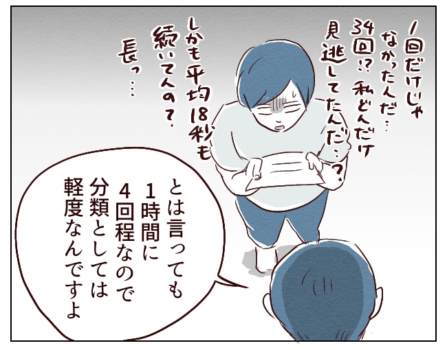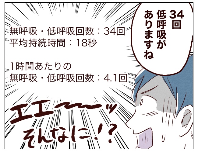 ちなみに34回も無呼吸・低呼吸がある!平均18秒!と言われて、そんなに息止まってんの!?とビックリしたんですが息が完全に止まってるというわけではないようです。