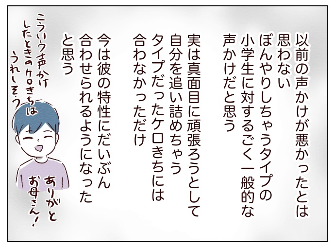 今はただ、ケロきちの「こうあるべきだ」と固まってしまった考えをほぐして楽に過ごせるよう繰り返し伝えるのみだと思っています。