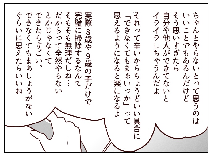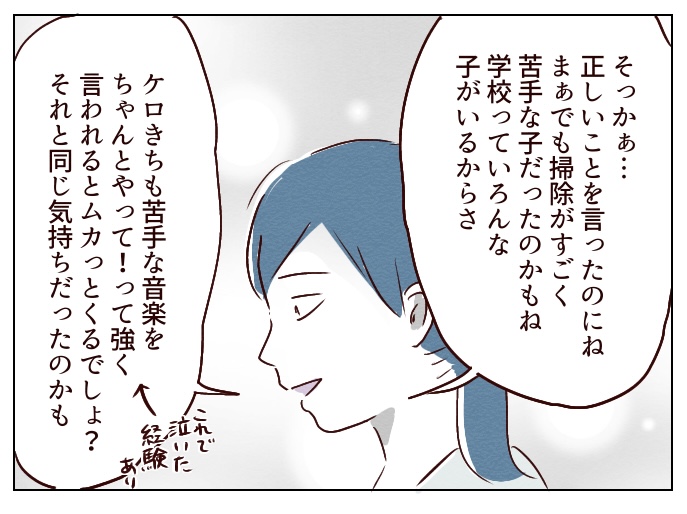 もちろん掃除してなくて言い返すほうが悪いんだけどさ…他の子はそういう子としてうまくスルーしてるところを、スルーできないんだよなぁ。