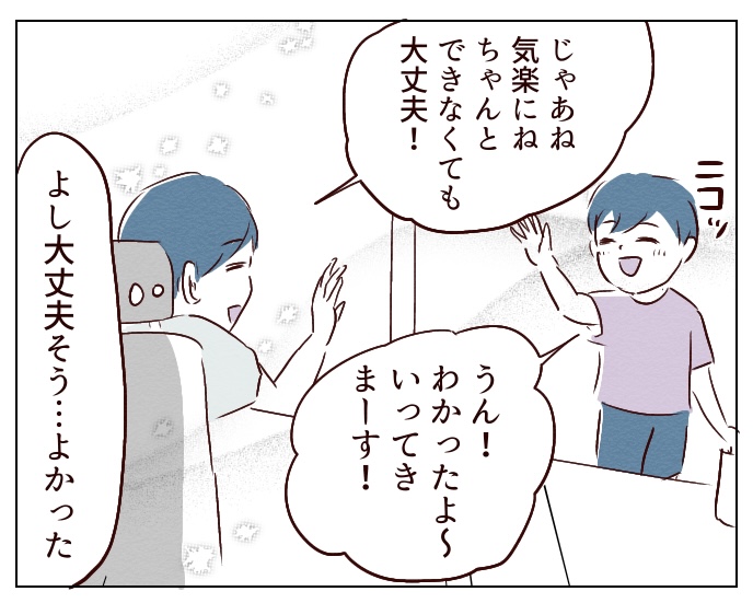 あと子供にイライラしてきて険悪なムードになった時の私のライフハックなんですが、送り出す直前って解放感からか優しい気持ちがちょっと顔を出すので、その気持ちを無視せずに思い切ってそっちの方向に思考を委ねる。
