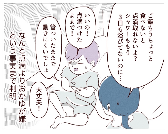 私の記憶では点滴してる間はぐったり元気がありませんでしたが、点滴外れたあたりから喉の痛み以外はほぼ全快でした。