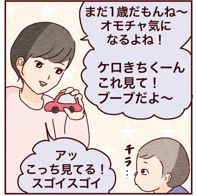 ↑おもちゃがあるとケロきちは毎回こんな感じだったんだけど、これ自閉の要素があるか大きな目安になるみたいですね。