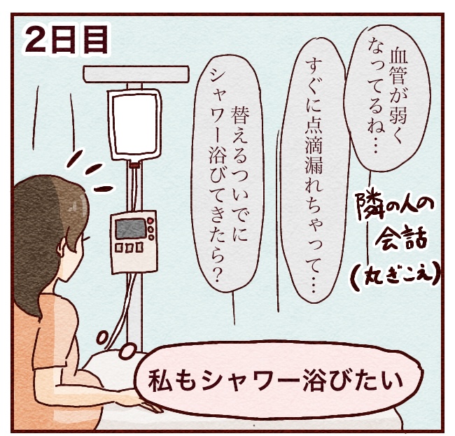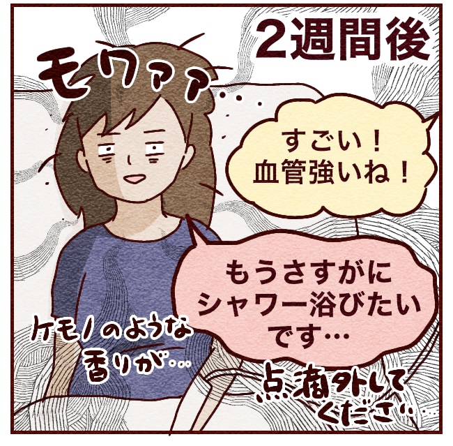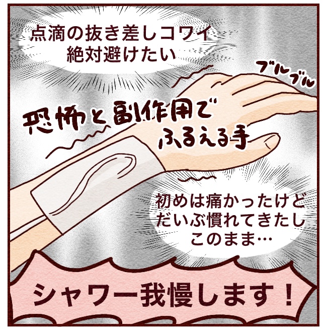 でもどうやら他の人は平均3日程度で血管に限界がきて薬液が漏れるなどで管の交換を余儀なくされ、そのタイミングでシャワーを浴びている様子。