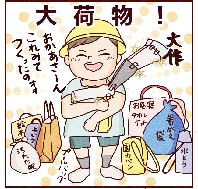 保育園は荷物が多いイメージだけど、幼稚園も結構なもんだなぁ〜。