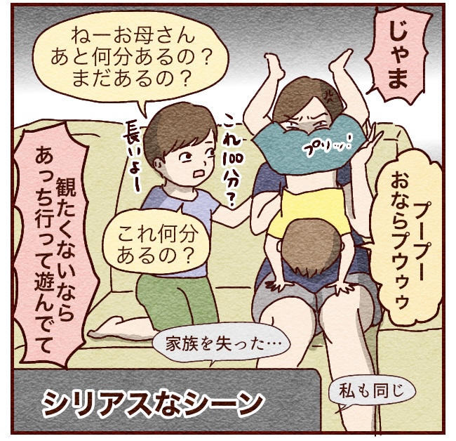 観るなら黙って観ろ!と思うけど、強く言うと2人ともギャン泣きで映画どころではなくなるので半分放置で済ませるのですが、
