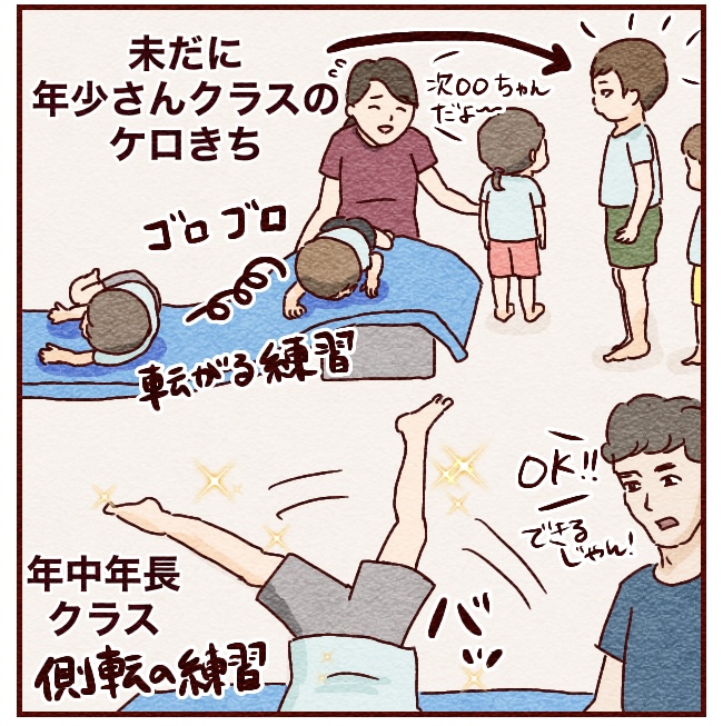 年中、年長さんクラスの子達が側転や逆上がりなどを華やかに練習しているのですが、そこにケロきちの姿はなく…