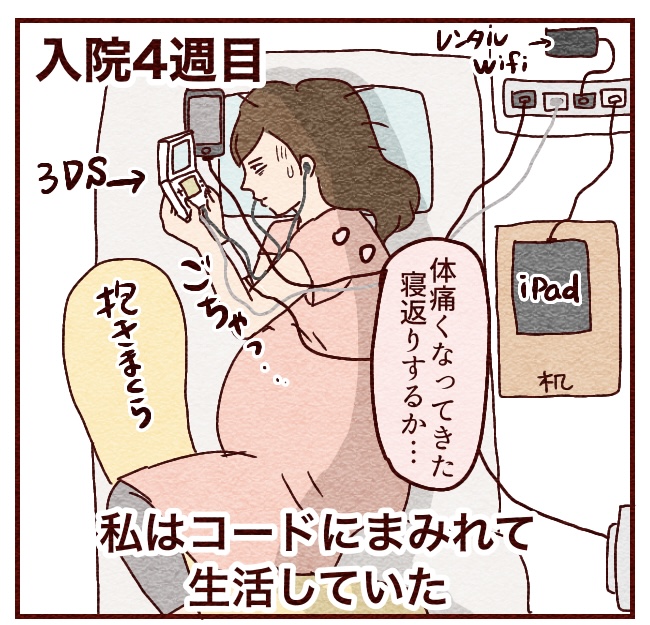 しかし24時間ベッドにいるわけだけど、腹がでかいので仰向けにもうつ伏せにもなれず、できるのは「シムスの体位」とかいう横向きの体勢のみ。