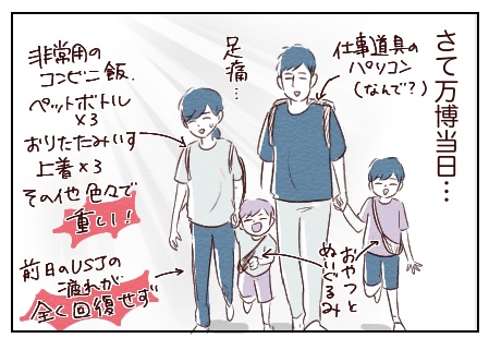 前日にUSJで朝から晩まで歩き通しで、万博到着時点ですでに私の足が限界だったこと。(子供はなぜか大丈夫だった。若さってすごい)