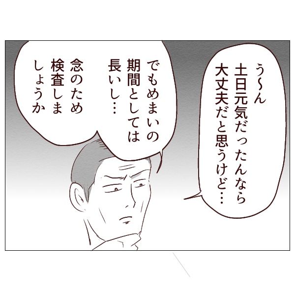 朝起きた時は確かにフラフラだけども「病院に行く」というイベントで気が紛れるのかやや元気な状態で来院しています。やっぱ心因性だよなぁ…とおもいつつも、万が一の大病の可能性はつぶしておきました。