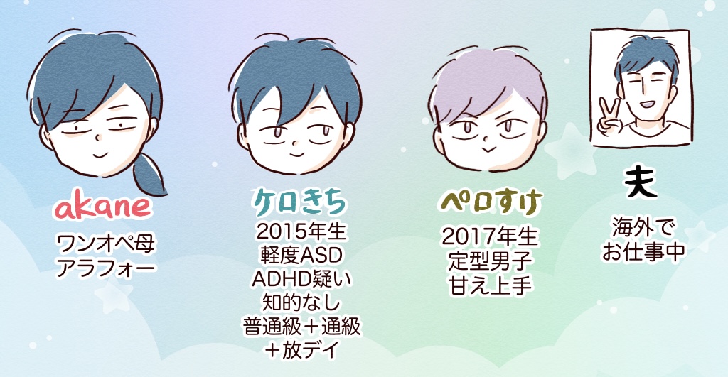 instagramでも活動中の「akane」のオフィシャルブログ。9歳(軽度ASD、軽度ADHD疑い、知的なし、普通級+通級)と7歳定型児の兄弟を子育て中。夫単身赴任実家義実家遠方のガチワンオペ母。